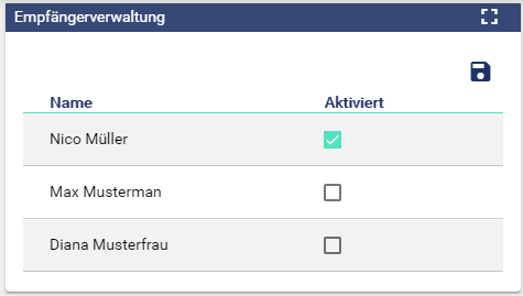 Das Widget Empfängerverwaltung zeigt alle zuvor angelegten Empfänger eines Mandanten an. Mit diesem Widget ist es wie auch in der Konfiguration des jeweiligen Mandanten möglich, einzelne Empfänger zu aktivieren oder zu deaktivieren. Sind die Empfänger deaktiviert, werden diese in der Alarmierung nicht berücksichtigt. Ist ein Empfänger aktiviert erhält er bei einer Alarmierung z.B. nach Bereitschaft und Kaskade eine Aufforderung zum Quittieren (SMS, Email, VoIP, Push-App).