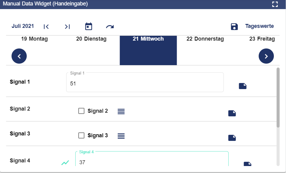 Das Handeingaben Widget visualisiert eine ausgewählte Liste von analogen, digitalen und Zähler Eingängen. Die Liste stellt Ihnen über ein Erfassungs-Intervall die ausgewählten Ist-Daten zum Zeitpunkt, den Sie ausgewählt haben, zur Verfügung. Wenn Sie feststellen, dass ein oder mehr Werte nicht den Grenzwerten entsprechen oder Sie gegebenenfalls nachregeln müssen, können Sie durch eine Eingabe im jeweiligen Feld den Sollwert des Objektes bestimmen. Außerdem können Sie dem ausgewählten Datensatz eine Notiz hinzufügen, um z.B.: eventuelle Duplikate ausschließen zu können oder um sich Grenzwerte zu notieren.