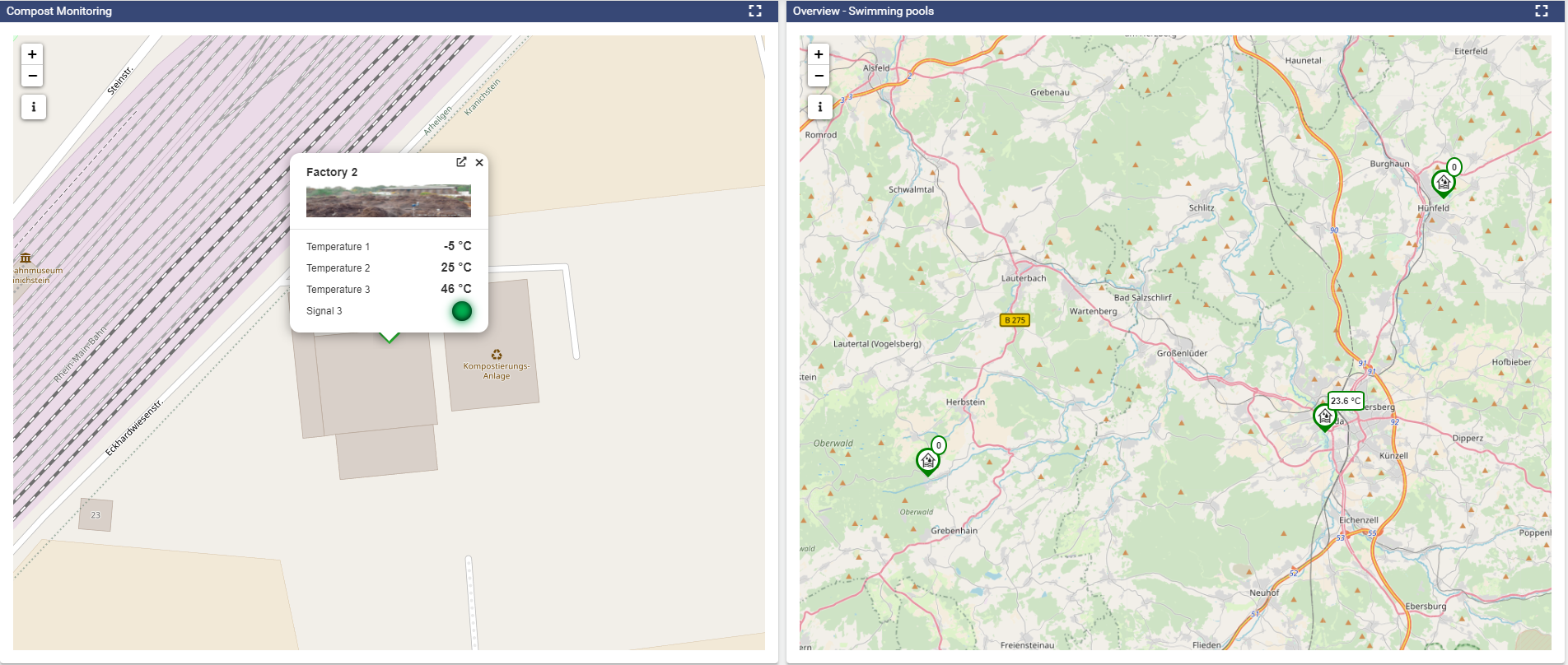 Mit der Landkarte visualisieren Sie eine Open-Street-Map Karte mit unterschiedlichen Markern und Icons. Sie können so Ihre Objekte/Anlagen optimal darstellen und immer auf einen Blick sehen, ob an dem von Ihnen ausgewählten Landmarke eine Störung (nicht quittiertes Ereignis) oder ähnliches vorliegt. Dies kann helfen, Mitarbeiter zu benachrichtigen, um schnell und effizient Probleme zu lösen. Wenn ich einen Marker anklicke erhalte ich zusätzliche Informationen und die Möglichkeit in ein entsprechendes Dashboard zu “springen” (oben rechts der Pfeil, der aus dem Kästchen zeigt).