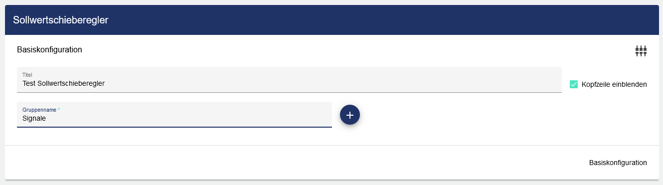 In der Basiskonfiguration des Sollwertschiebereglers vergeben Sie eine geeignete Beschriftung (Titel). Durch die Auswahl des Hakens kann die Kopfzeile eingeblendet werden. Ebenfalls müssen Sie einen Gruppennamen hinzufügen. Über das „+“ Icon erstellt sich die zugehörige Konfiguration der Gruppe.