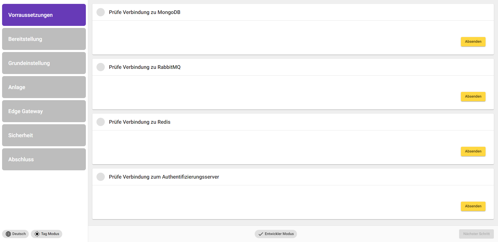 Voraussetzungen | Hier wird die Verbindung zu verschiedene Datenbanken und Servern geprüft. Die Prüfung kann einige Sekunden in Anspruch nehmen. Klicken sie bei jedem Reiter auf “Absenden”. ![]() Ist die Überprüfung gescheitert geben Sie in PowerShell folgende Befehle ein:
