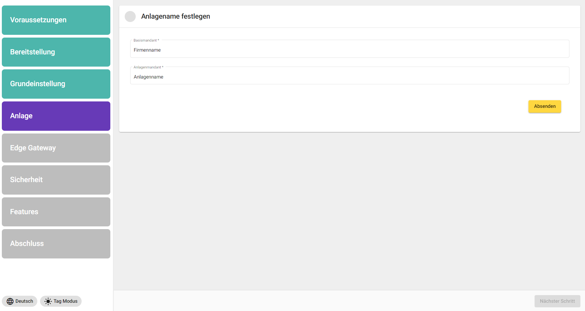 Anlage | Hier muss ein Basismandant und ein Anlagenmandant festgelegt werden. Tipp: Nennen Sie den Basismandant nach Ihrer Firma und den Anlagenmandanten nach ihrem Themenbereich, in dem die SCADA einen Mehrwert generieren soll. ![]() |