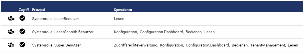 Jeder Mandant beinhaltet im Default drei Zugriffsrechte, welche jeweils eine Systemrolle in der Administration definieren. Diese Standard Zugriffsrechte sind unveränderbar.