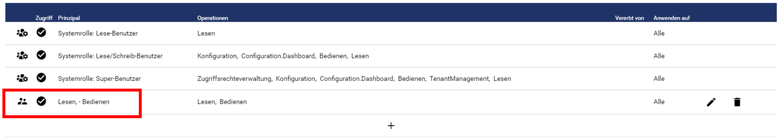Die Tabelle zeigt eine Übersicht, welcher Rolle (Prinzipal) welche Zugriffsrechte (Operationen) zugewiesen wurden. Über den Stift können die Zugriffsrechte bearbeitet werden, über die Tonne werden Sie wieder gelöscht.