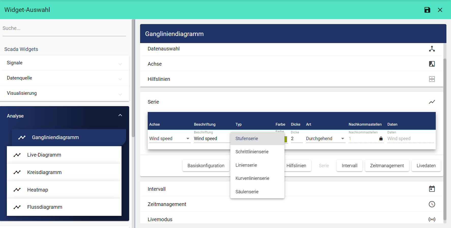 2.) Ein neuer Linientyp, die “Stufenserie”, wurde im Widget: Gangliniendiagramm eingeführt, wodurch sich die Übersichtlichkeit von Diagrammen deutlich steigern lässt. Wie auch in der “Schrittlinienserie” werden alle Prozesswertänderungen als Stufen abgebildet und der Bereich darunter zusätzlich noch farbig dargestellt.