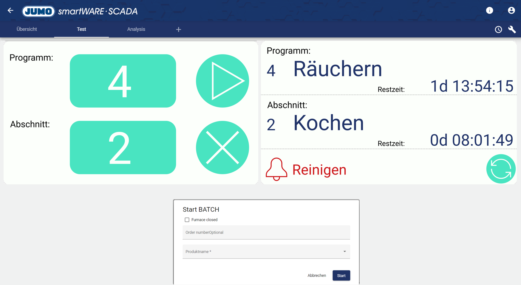 Ein Programm lässt sich über die SCADA mittels Prozessbild auswählen und erst dann starten, wenn die Chargendaten im “Start Batch”-Feld korrekt eingegeben wurden.