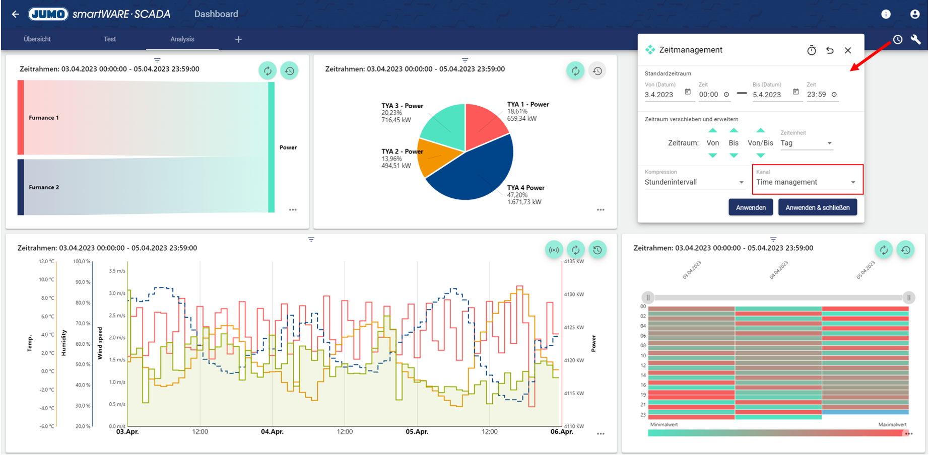 12.) Die Zentrale Zeitsteuerung wurde überarbeitet und optimiert. Nun lässt sich mit dem bekannten “Zeitmanagement” ein Kanal auswählen, um alle gewünschten Widgets: Analysis zu steuern. Im unteren Beispiel wurde mit einem Klick die Zeitspanne aller Widgets gesetzt. Somit kann der Zeitbereich vom 03.04. bis 05.04 einfach und schnell ausgewertet werden.