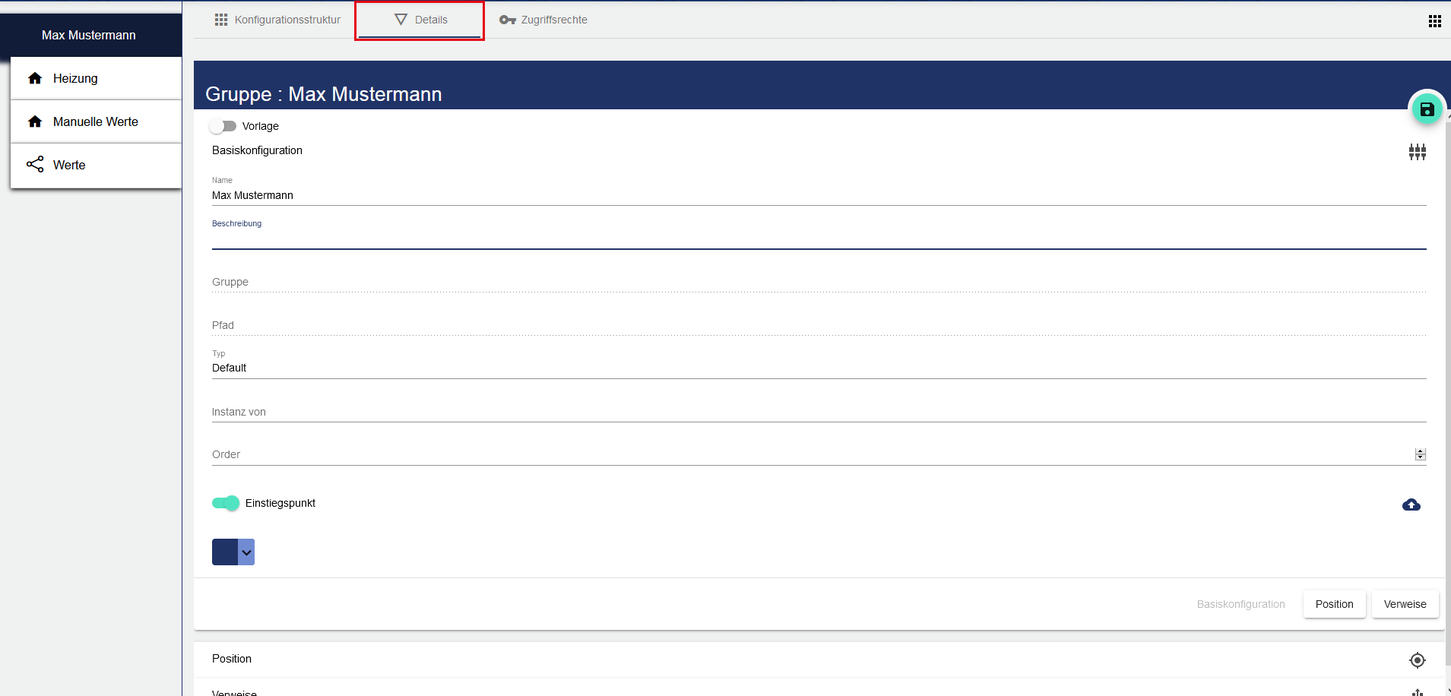 Der Name der Gruppe ist frei wählbar und ein Pflichtfeld. Der Name erscheint innerhalb der Sidebar sowohl in der Konfiguration als auch im Dashboard.