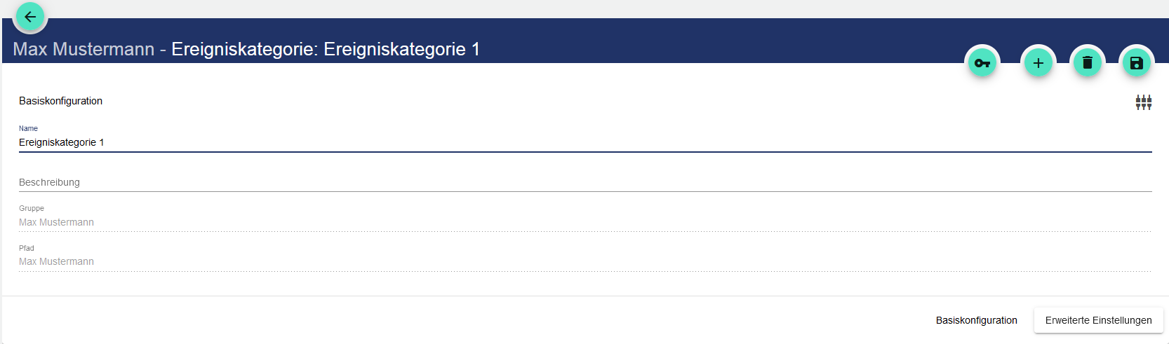 Name der Ereigniskategorie in der Basiskonfiguration vergeben. Das Feld Beschreibung ist optional nutzbar. Das Feld “Gruppe” zeigt, in welchem Mandanten diese Ereigniskategorie angelegt wurde. Der Pfad wird systemseitig automatisch generiert.