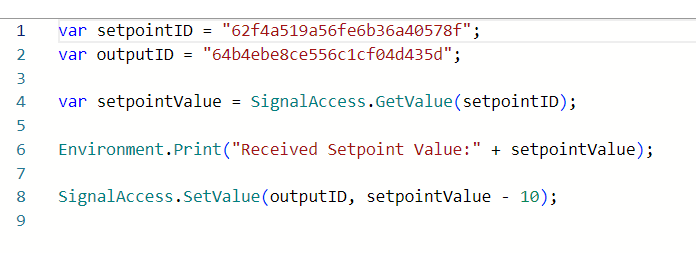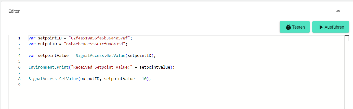 Mit der Funktion SignalAccess.SetValue({SignalID}, {Value}): void kann der Wert eines Signals (Ausgang) gesetzt werden, d.h. der im zweiten Parameter {Value} spezifizierte Wert wird an das Gateway gesendet oder im Fall eines virtuellen Signals (Signal ohne Datenquelle und Datenverbindung) als Live-Wert erzeugt. Das Signal wird über den ersten Parameter {SignalID} spezifiziert.