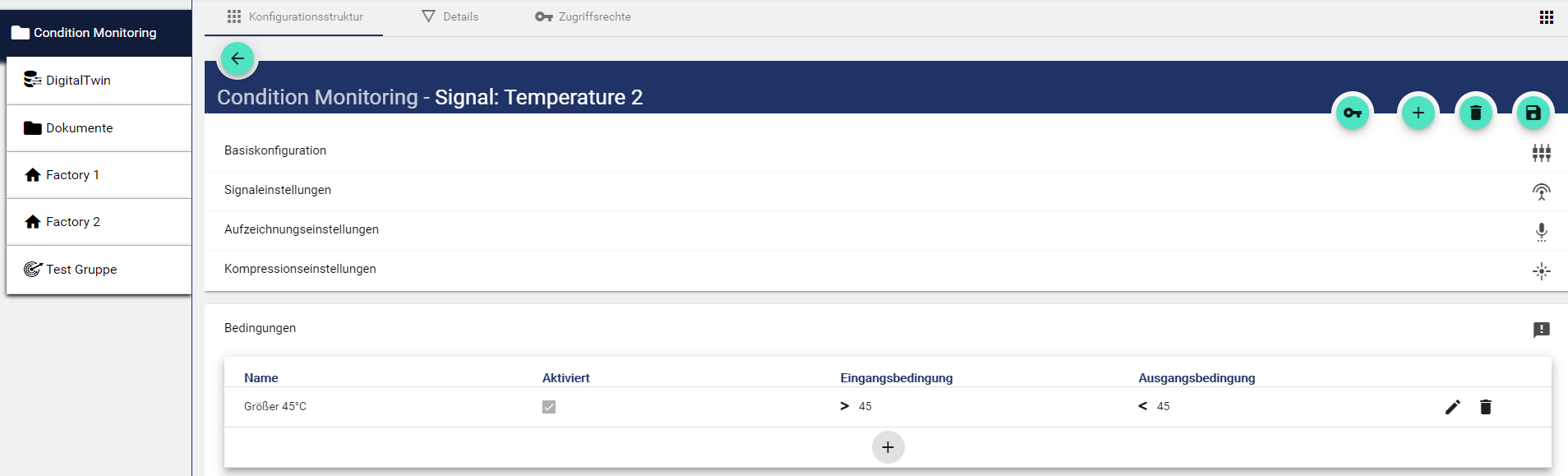 Eine Bedingung ist ein optional einstellbarer Grenzwert, der bei Eingangsbedingung aktiv wird und bei Ausgangsbedingung abfällt. Er kann für nachfolgende Alarmierungen verwendet werden.