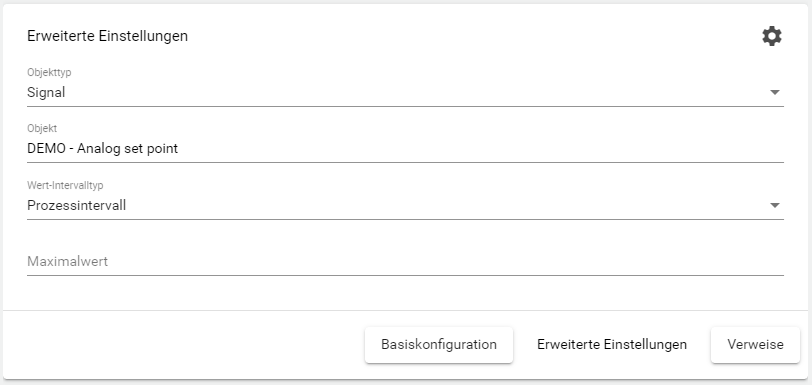 Maximumüberwachung: Die Signalwerte (bzw. Formelwerte) aus dem ausgewählten “Objekt” müssen im gewählten “Intervalltyp” den eingestellten “Maximalwert” überschreiten, damit ein Ereignis bzw. Alarm ausgelöst wird.