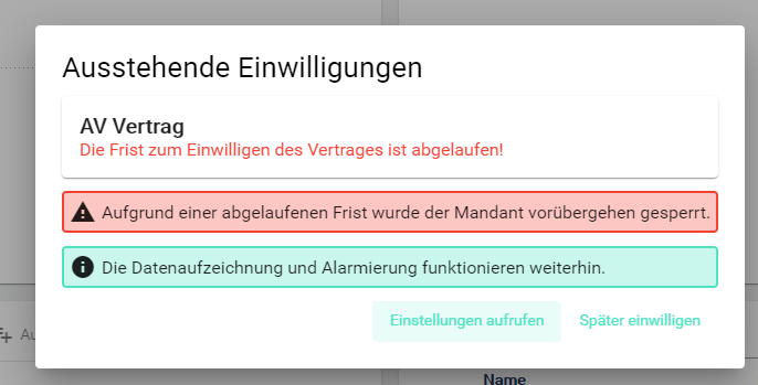 Bei Nicht - Einwilligung und Ablauf der einstellten Zeit erscheint nachfolgender Text. Jede Ansicht mit Ausnahme der "Administration" ist gesperrt. Klickt ein Kunde auf ein Element des Mandanten, landet er auf der Startseite und erhält diese Information.