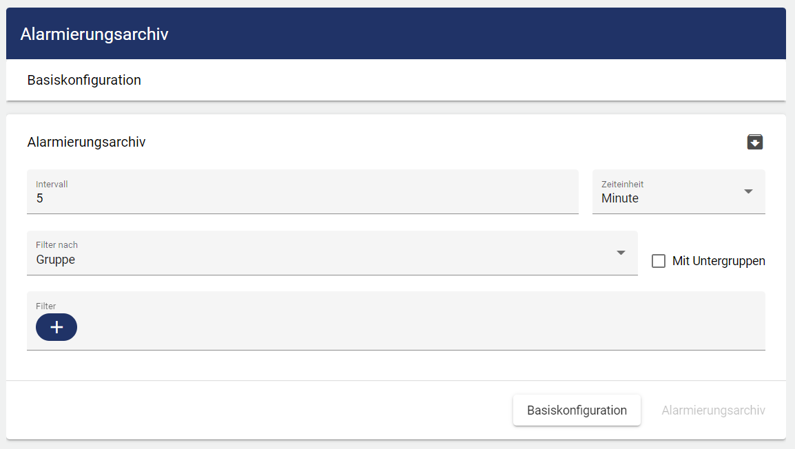 In der Basiskonfiguration des Alarmierungsarchiv vergeben Sie eine geeignete Beschriftung (Titel). Durch die Auswahl des Hakens kann die Kopfzeile eingeblendet werden.