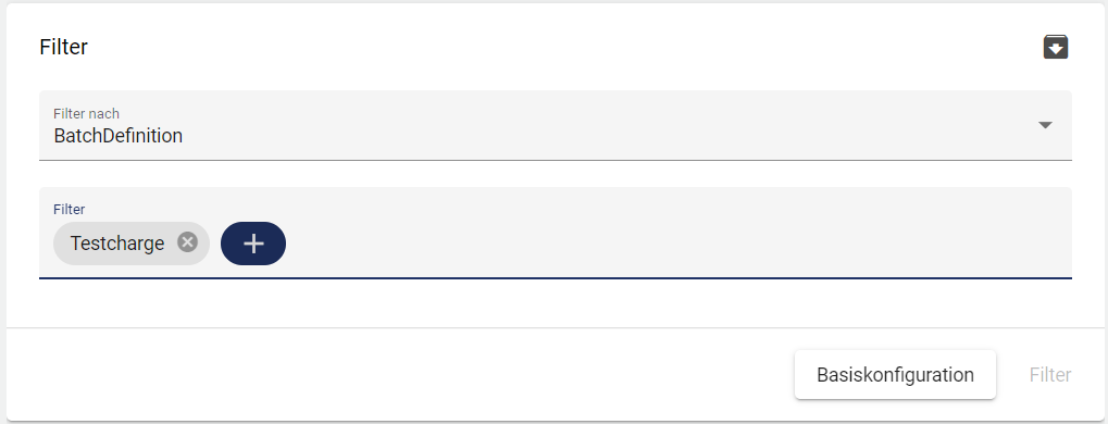Hier kann eine zuvor in der Konfiguration unter angelegte Charge nach “Chargendefinition” oder nach “Gruppe” ausgewählt werden.
