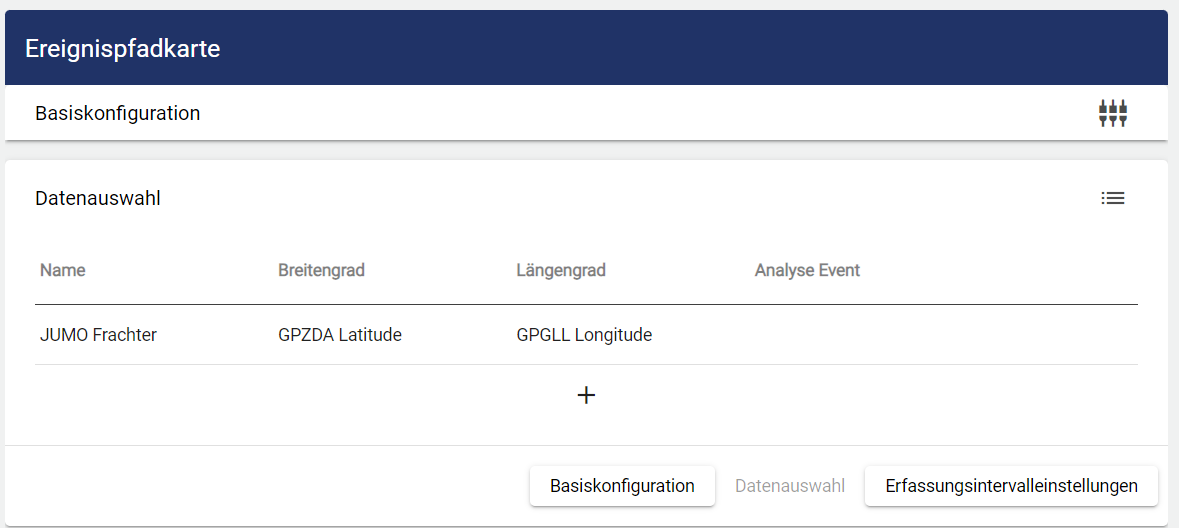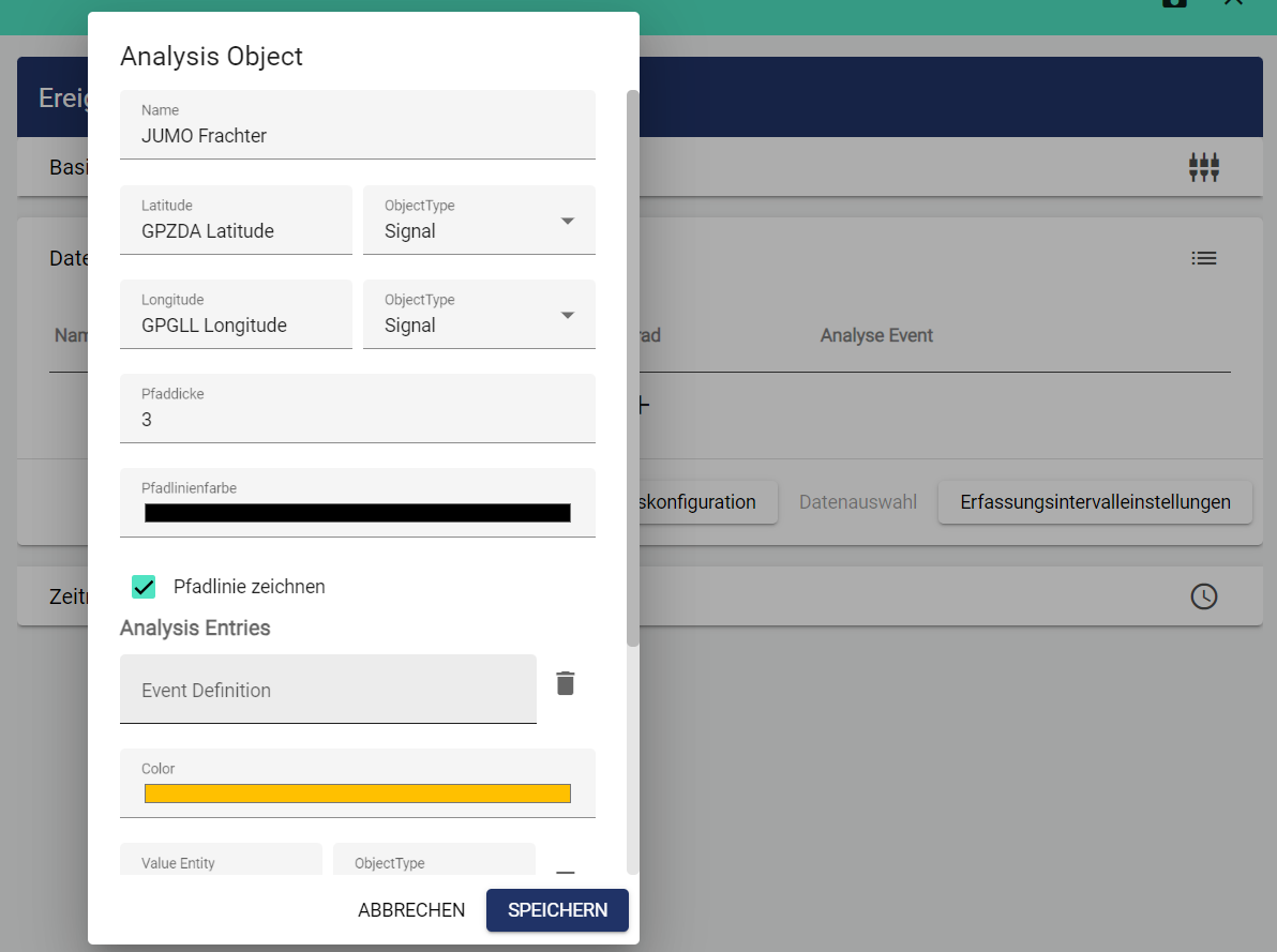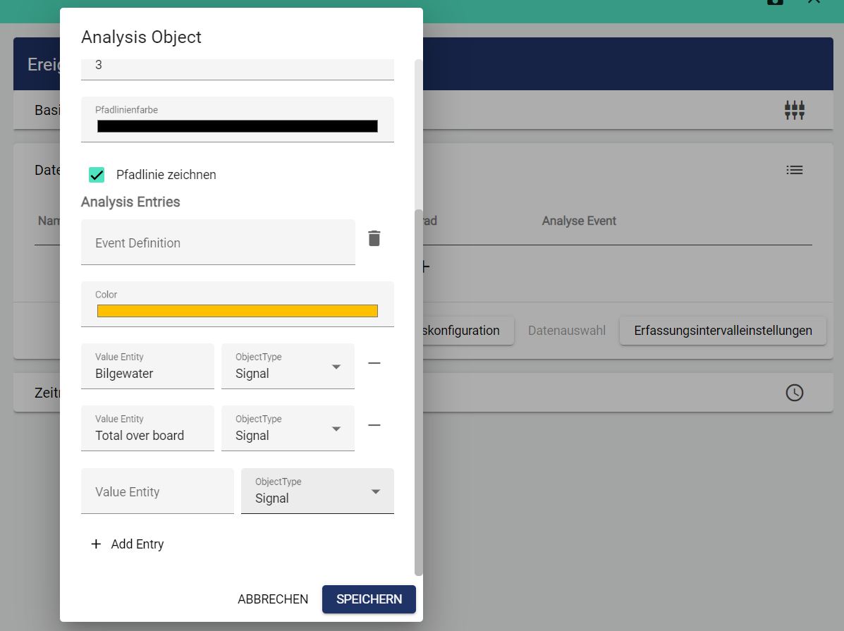 Anschließend können Signalwerte ereignisbasiert bei Ereignis-Start S und Ereignis-Ende E festgehalten werden. Zudem kann dieser Ereignis-Verlauf auf der Karte farblich hervorgehoben werden. Hierfür wählen Sie ein passendes Ereignis und tragen die zu überwachenden Signale ein.