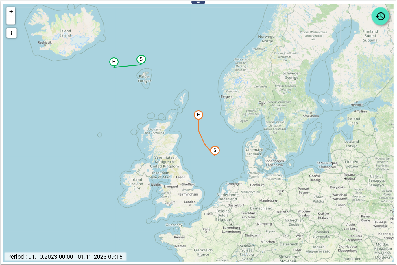 Mit der Ereignispfadkarte kann die Bewegungshistorie von Objekten auf der Landkarte dargestellt und analysiert werden. Zusätzlich können Signalwerte ereignisbasiert bei Ereignis-Start S und Ereignis-Ende E festgehalten werden. Zudem wird dieser Ereignis-Verlauf auf der Karte farblich hervorgehoben. So lässt sich beispielsweise der Ablauf der Bilgenwasserentsorgung oder weitere Verklappungen je Schiff lückenlos abbilden und nachweisen. Über die integrierte Zeitsteuerung können bereits vergangene Verläufe und Ereignisse eingesehen werden.