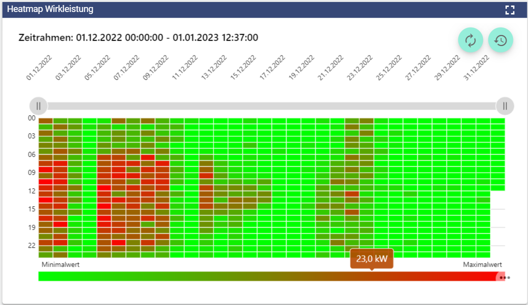 Das Heatmap Diagramm wird vor allem im Bereich der Energiewirtschaft im Rahmen der ISO 50.001 Norm verwendet. Es stellt pro Tag 24 Signalmittelwerte dar. Über den oberen Grünen Pfeil, können historische Perioden betrachtet und ausgewertet werden.