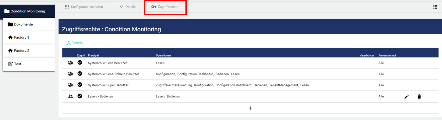 Die Tabelle zeigt eine Übersicht, welcher Rolle (Prinzipal) welche Zugriffsrechte (Operationen) zugewiesen wurden. Über den Stift können die Zugriffsrechte bearbeitet werden, über die Tonne werden Sie wieder gelöscht.