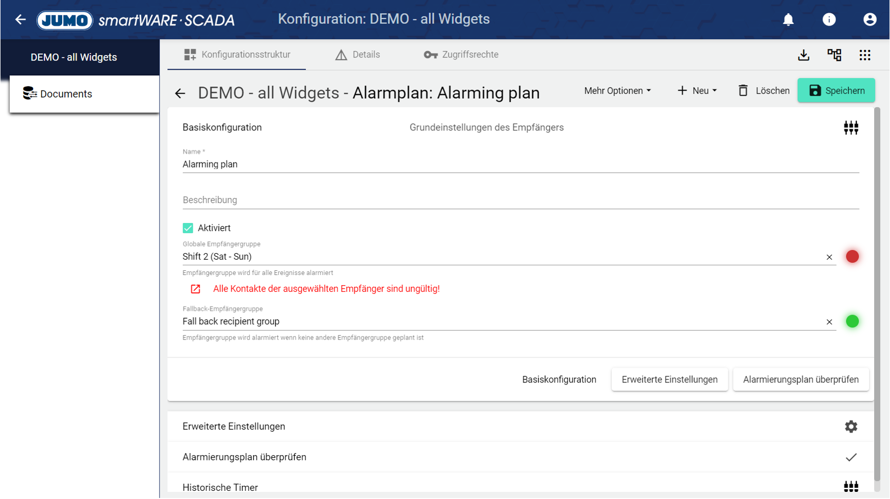 3.b) Zusätzlich zu den bereits in 3.a) erwähnten Widgets gibt es entsprechende Ergänzungen in der Konfiguration des Alarmplans. So kann nun ab sofort erkannt werden, ob alle Einstellungen, z. B. in der verknüpften Empfängergruppe, korrekt getätigt wurden. Wie auch im Widget kann der Alarmplan bei der Konfiguration nach Datum überprüft werden. Wurde der Alarmplan mittels “Widget: Alarmplan Timer” deaktiviert bzw. aktiviert, lässt sich dies im Reiter “Historischer Timer” einsehen.