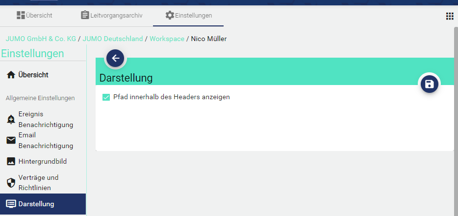 1) Es kann nun in der Administration eines Mandaten unter Darstellung festgelegt werden, ob der gesamte Pfad im Header der Dashboards angezeigt werden soll. Als Standard wird immer der erste Gruppenname und das jeweilige Dashboard angezeigt.