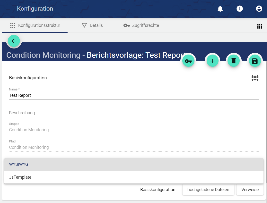Über die Auswahl der Schaltfläche “Berichtsvorlage” kann eine bereits angelegte Berichtsvorlage bearbeitet werden. Über das Plus wird eine neue Berichtsvorlage angelegt.