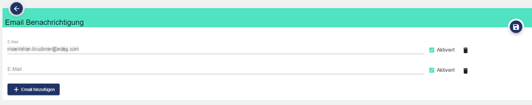 Im Textfeld “E-Mail” muss die E-Mail Adresse eingegeben werden, an die die Benachrichtigung gesendet werden soll. Über den Button “Email hinzufügen” können weitere E-Mail Adressen ergänzt werden. Soll eine angelegte E-Mail Adresse temporär keine Benachrichtigungen mehr erhalten, kann der Haken bei “Aktiviert” herausgenommen werden. Der Haken kann jederzeit erneut gesetzt werden.