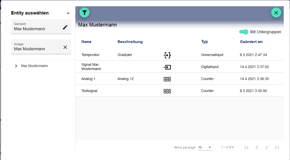 3. Durch Klicken auf das Feld “Signal” öffnet sich ein weiteres Fenster. Dort kann ein zuvor angelegtes Signal ausgewählt werden. Dabei wird der von der Formel errechnete Wert auf das Signal geschrieben. Im Hintergrund wird anschließend alle 10 Sekunden die Formel ausgerechnet und als Live-Wert sowie als historischer Wert für das Signal abgespeichert. Das Signal kann dann wie jedes andere Signal in den Widgets und mit verschiedenen Kompressionen verwendet werden.