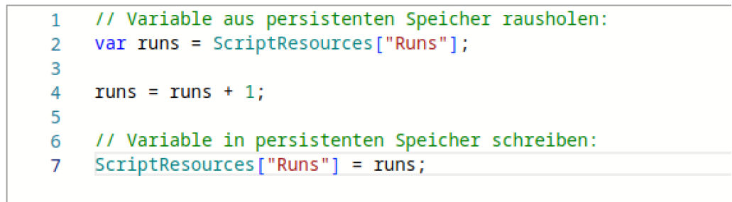 Es kann vorkommen, dass man bestimmte Variablen oder Werte {Message} persistent speichern will, um sie bei der nächsten Ausführung des Skriptes zu verwenden. Dies ermöglicht das Objekt ScriptResources[{Message}].