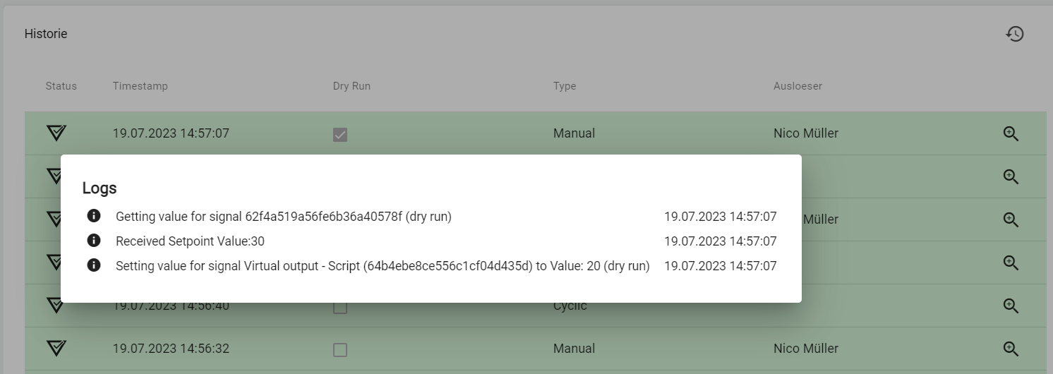 Jede Auslösung des Skriptes wird in der Historie gespeichert. Eine Manuelle Auslösung über den “Testen” oder “Ausführen” Button wird als Manueller Eintrag festgehalten. Ein “Testen” erzeugt einen “Dry Run”, in dem keine tatsächlichen Skript-Aktionen ausgeführt werden.
