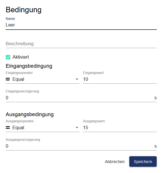 Eine Bedingung ist ein optional einstellbarer Grenzwert, der bei Eingangsbedingung aktiv wird und bei Ausgangsbedingung abfällt. Er kann für nachfolgende Alarmierungen verwendet werden.