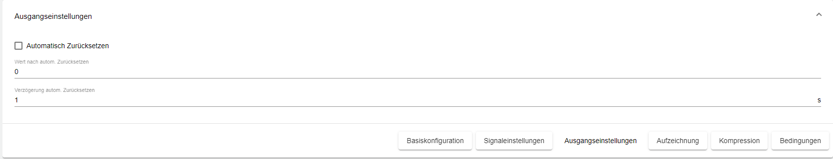In den Ausgangseinstellungen kann ein Wert festgelegt werden, auf den das Signal mit der Funktion “Automatisch zurücksetzen” gesetzt wird, nachdem es an das IoT Gerät geschickt wurde.