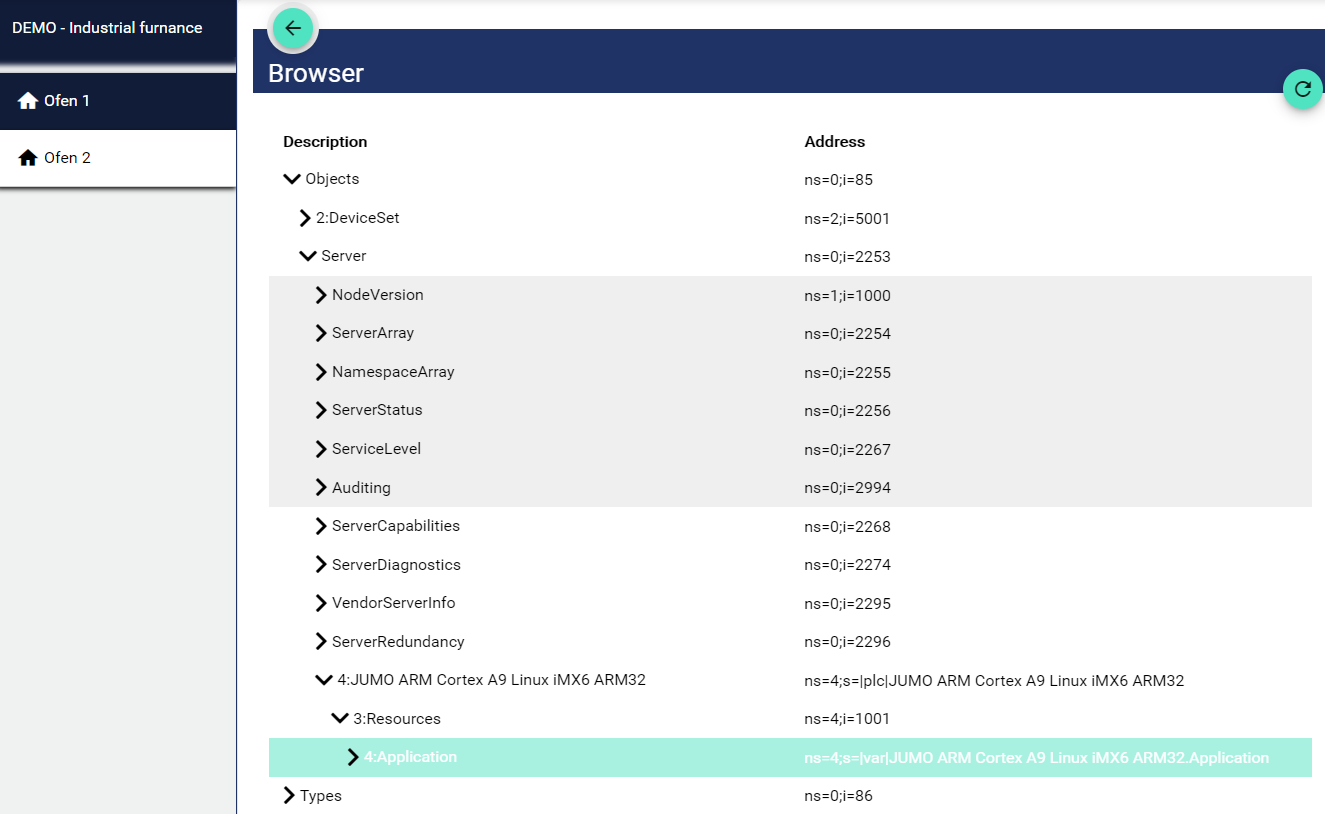 Bei OpcUa kann mit der "Browse" Funktion über das “Globus”-Symbol auf die Adressen innerhalb der Steuerung bzw. des OPC UA Servers (z.B. dem des JUMO variTRON) zugegriffen werden.