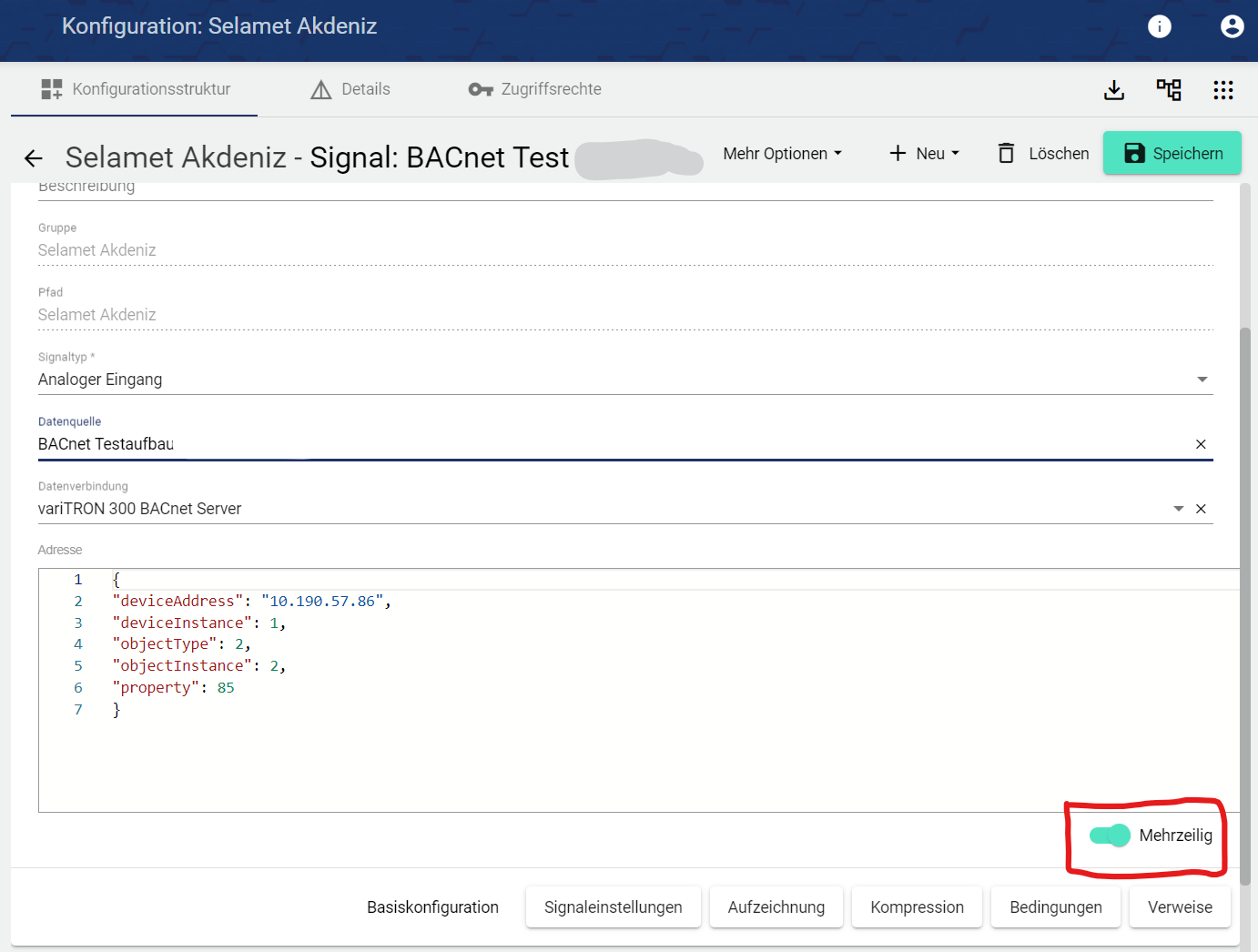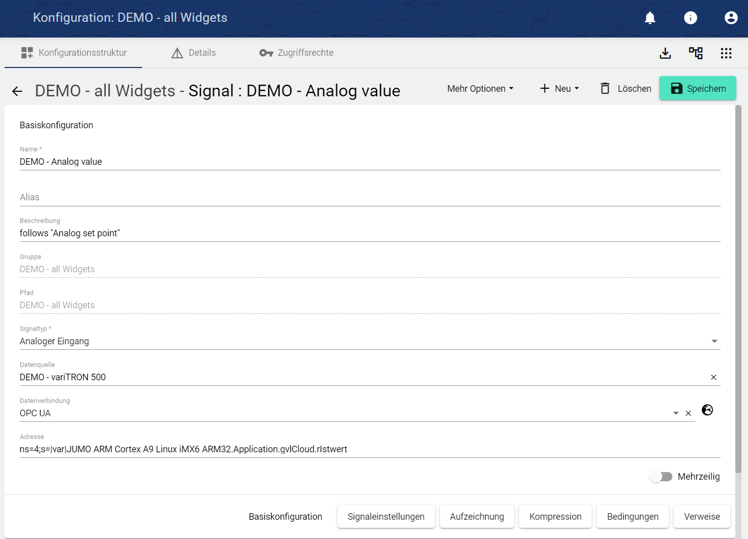 Name des Signals in der Basiskonfiguration vergeben. Das Feld Beschreibung ist optional nutzbar. Das Feld “Gruppe” zeigt, in welcher Gruppe dieses Signal angelegt wurde. Der Pfad wird systemseitig automatisch generiert.