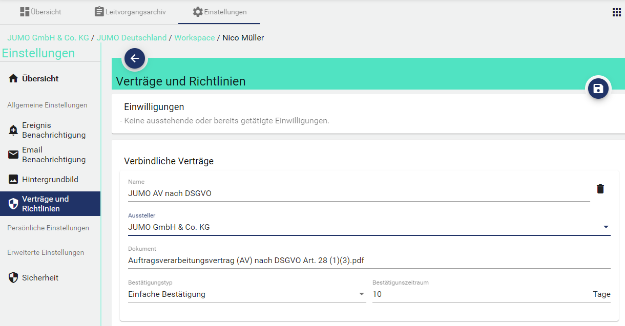 Diese Funktion dient dazu, Verträge oder Richtlinien mit Mandanten zu vereinbaren und zu unterzeichnen. Generell kann über diesen Einstellungspunkt jedes Vertragsdokument mit dem Mandanten bzw. Kunden hinterlegt werden.