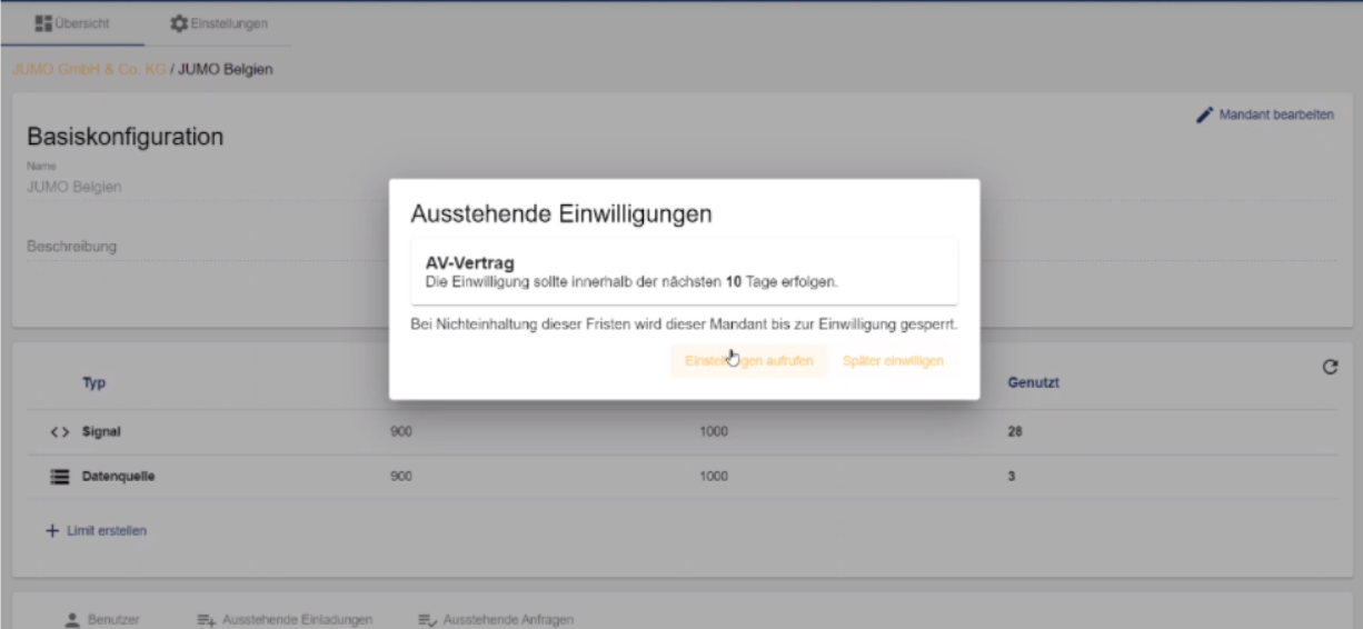 Geht eine Peron nun in der entsprechenden Mandanten (hier JUMO Belgien) in dem zuvor ein Vertrag aktiviert worden ist, erhält er diese Meldung mit der Aufforderung zur Annahme. Nimmt die Person an. Gilt der AV für alle Personen, die in diesem Mandanten zugehörig sind.