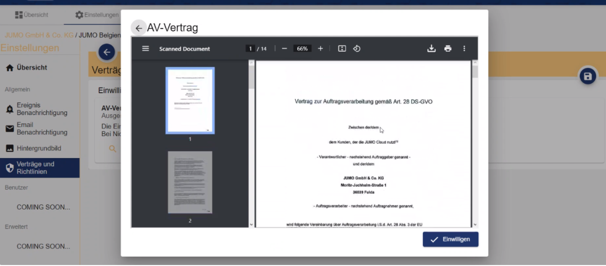 In der Administration des jeweiligen Mandanten unter Verträge und Richtlinien den JUMO Cloud AV unter Vertrag hinzufügen hochladen: