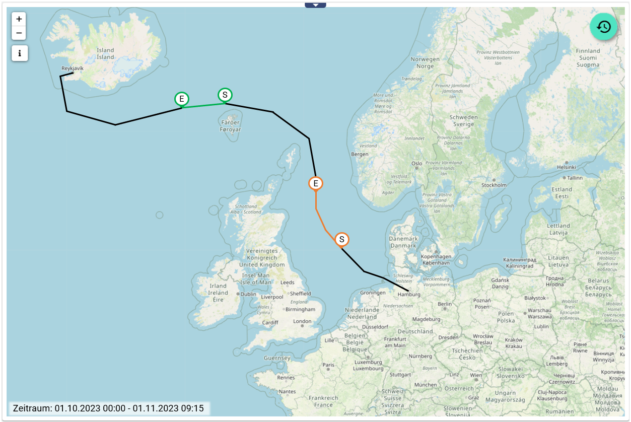 Mit der Ereignispfadkarte kann die Bewegungshistorie von Objekten auf der Landkarte dargestellt und analysiert werden. Zusätzlich können Signalwerte ereignisbasiert bei Ereignis-Start S und Ereignis-Ende E festgehalten werden. Zudem wird dieser Ereignis-Verlauf auf der Karte farblich hervorgehoben. So lässt sich beispielsweise der Ablauf der Bilgenwasserentsorgung oder weitere Verklappungen je Schiff lückenlos abbilden und nachweisen. Über die integrierte Zeitsteuerung können bereits vergangene Verläufe und Ereignisse eingesehen werden.