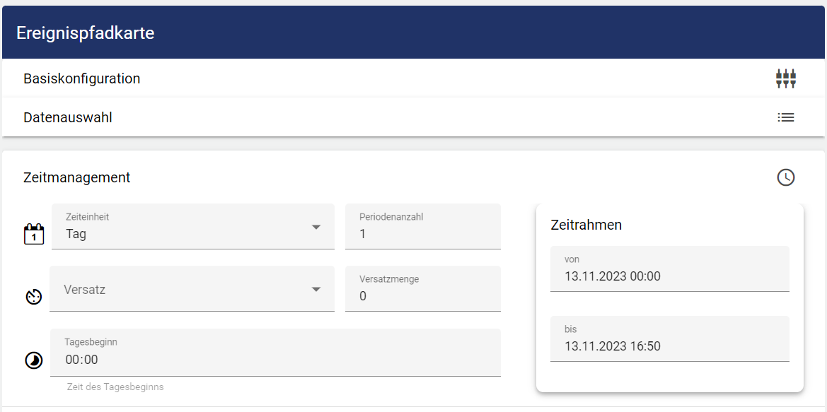 | Offset/Versatz. Mit dieser Einstellung kann ein Versatz für den Zeitrahmen bestimmt werden. Sowohl in die Vergangenheit, als auch in die Zukunft. |