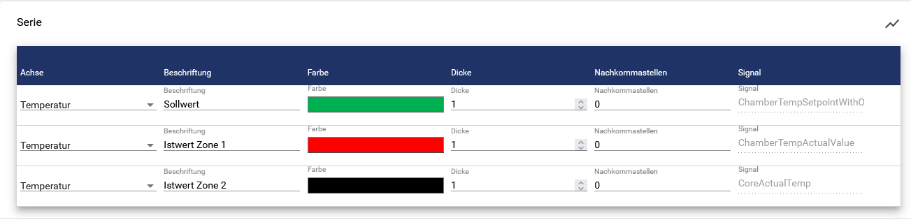 Für alle ausgewählten Datenpunkte wird automatisch eine Serie erstellt. Für jedes Signal, muss eine entsprechende Achse zugewiesen werden. Sie können weiterhin optional die Beschriftung, die Farbe sowie die Dicke der Linie und die Nachkommastellen im Diagramm bestimmen. In der Spalte “Signal” sieht man den Namen des hinterlegten Signals.