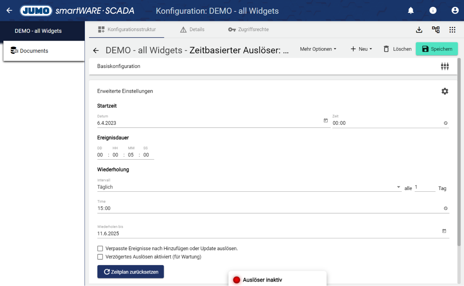 Über die Auswahl der Schaltfläche “Zeitbasierter Auslöser” kann ein bereits angelegter Auslöser bearbeitet werden. Über das Plus wird ein neuer angelegt.