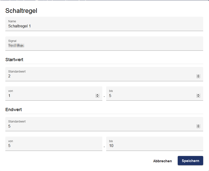 Start- und Endwert eintragen. Dieser kann nur zwischen den festgelegten Grenzen gesetzt werden und ist nur frei wählbar, wenn keine Schaltregel angelegt wurde.