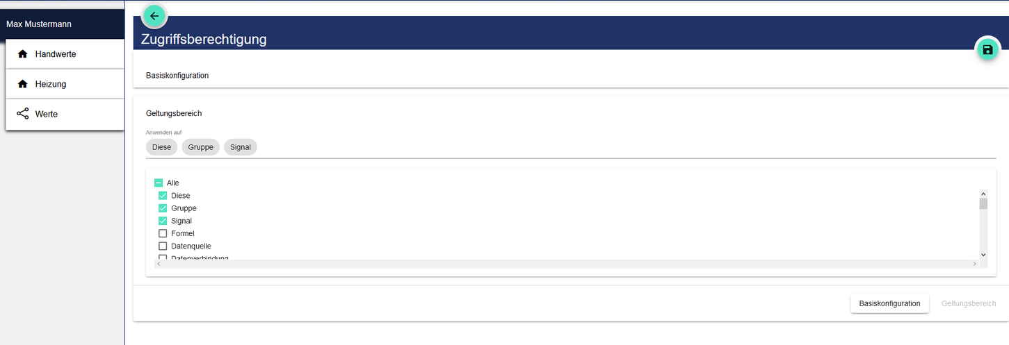 Die vergebenen Zugriffsrechte können zudem noch im Geltungsbereich auf bestimmte Bereiche (z.B. Gruppen, Signale usw.) eingeschränkt werden.