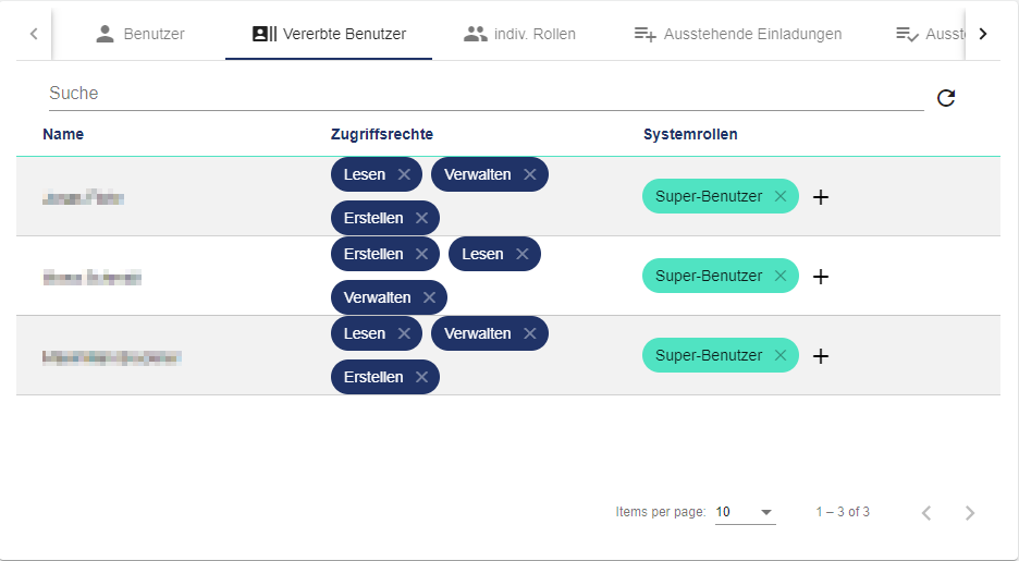 Vererbte Benutzer | Benutzer mit Zugriffsrechte aus Mandanten, die sich über diesem Mandanten befinden und vererbt wurden, können hier eingesehen werden. |