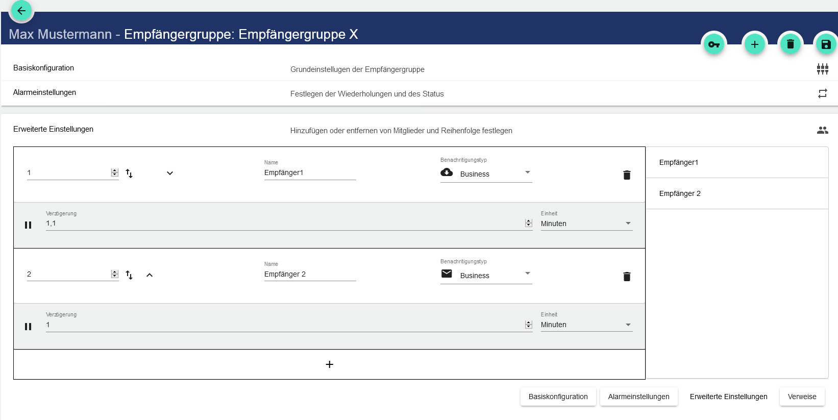 In den erweiterten Einstellungen der Empfängergruppen können Sie der ausgewählten Empfängergruppe Empfänger zuteilen und diese auch wieder entfernen. Hinzugefügte Empfänger werden im Falle einer Alarmierung benachrichtigt.