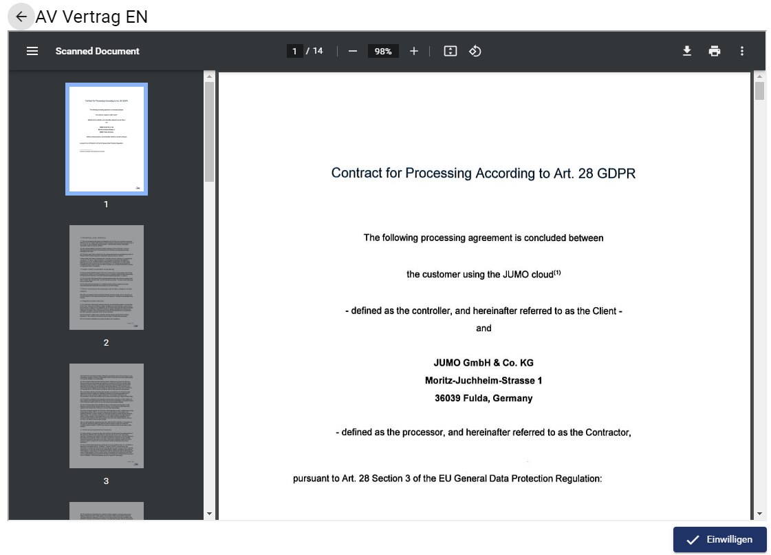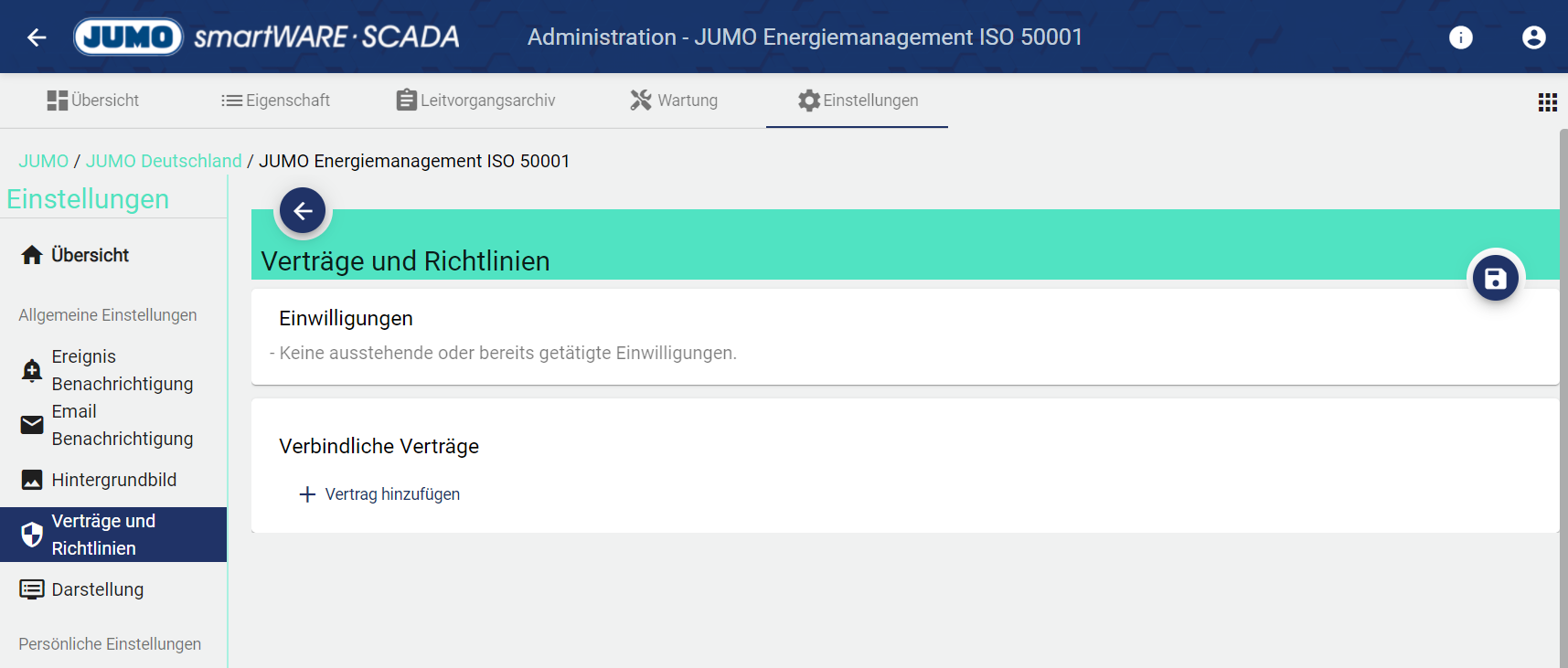 In der Administration des jeweiligen Mandanten unter Verträge und Richtlinien den JUMO Cloud AV unter Vertrag hinzufügen hochladen: