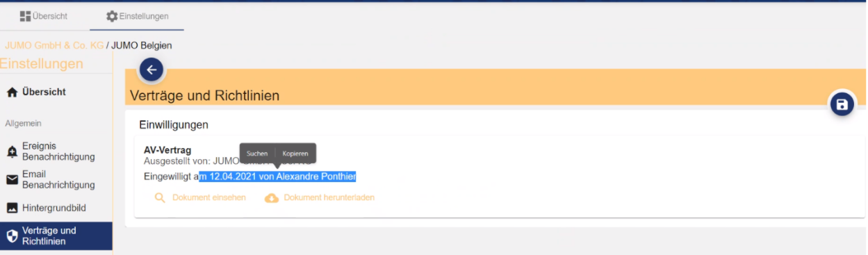 Geht eine Peron nun in der entsprechenden Mandanten (hier JUMO Belgien) in dem zuvor ein Vertrag aktiviert worden ist, erhält er diese Meldung mit der Aufforderung zur Annahme. Nimmt die Person an. Gilt der AV für alle Personen, die in diesem Mandanten zugehörig sind.