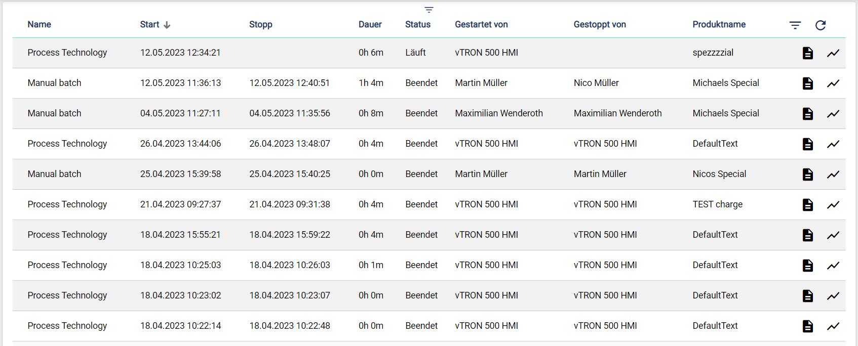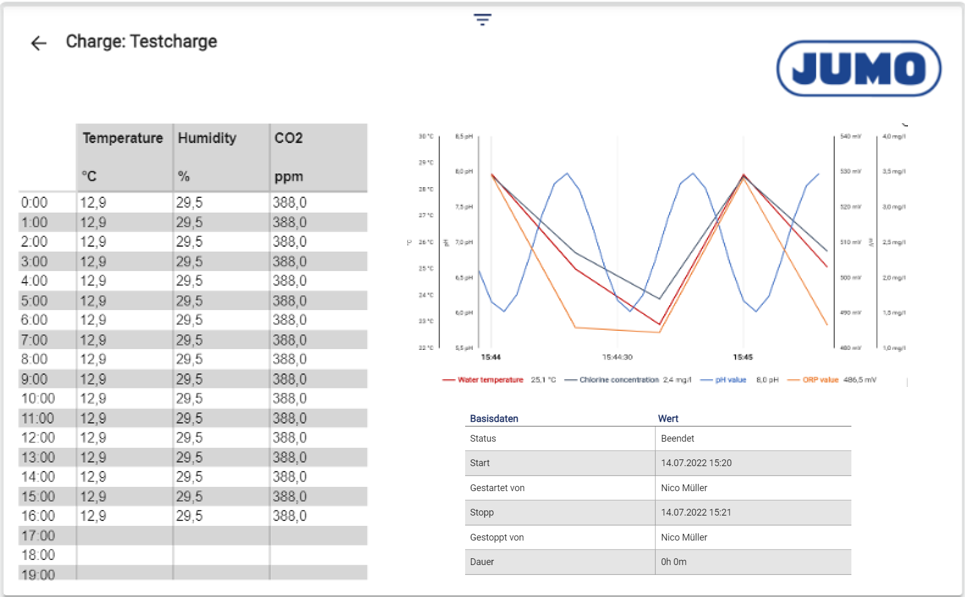 Im Chargenarchiv können alle abgeschlossenen und laufenden Chargen angezeigt und gefiltert werden. Ebenso können je Charge individuelle Reports, Signal-Kurvenverläufe und Kopfdaten eingesehen und ausgewertet werden.