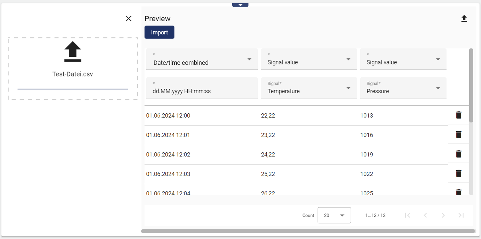 Mit dem Widget: Datenimport ist es möglich, historische Daten schnell und einfach in das System zu importieren. Hierzu wird lediglich eine CSV-Datei benötigt. Die Spalten, Zeilen und Formate können je nach Wunsch angepasst werden.