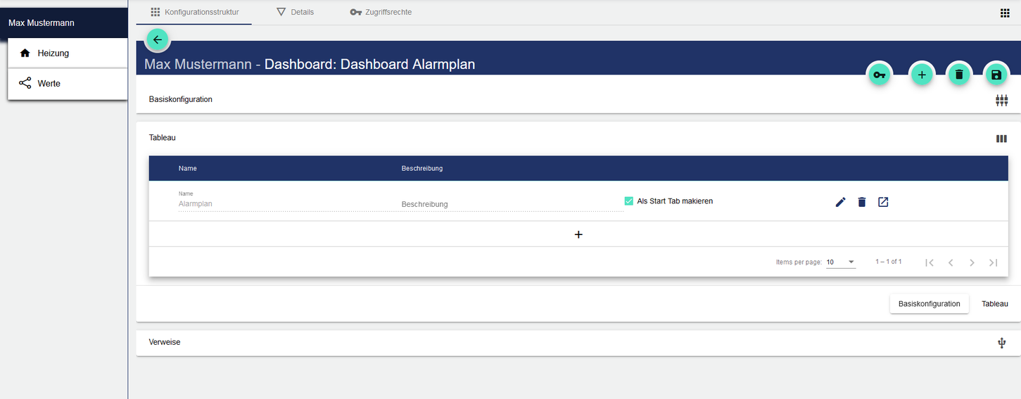 Wählen Sie nun ein Dashboard, um darauf das Widget des Alarmplans darstellen zu können. Bei der Basiskonfiguration ist ein sinnvoller Name einzutragen, um das Dashboard später leichter zu finden.